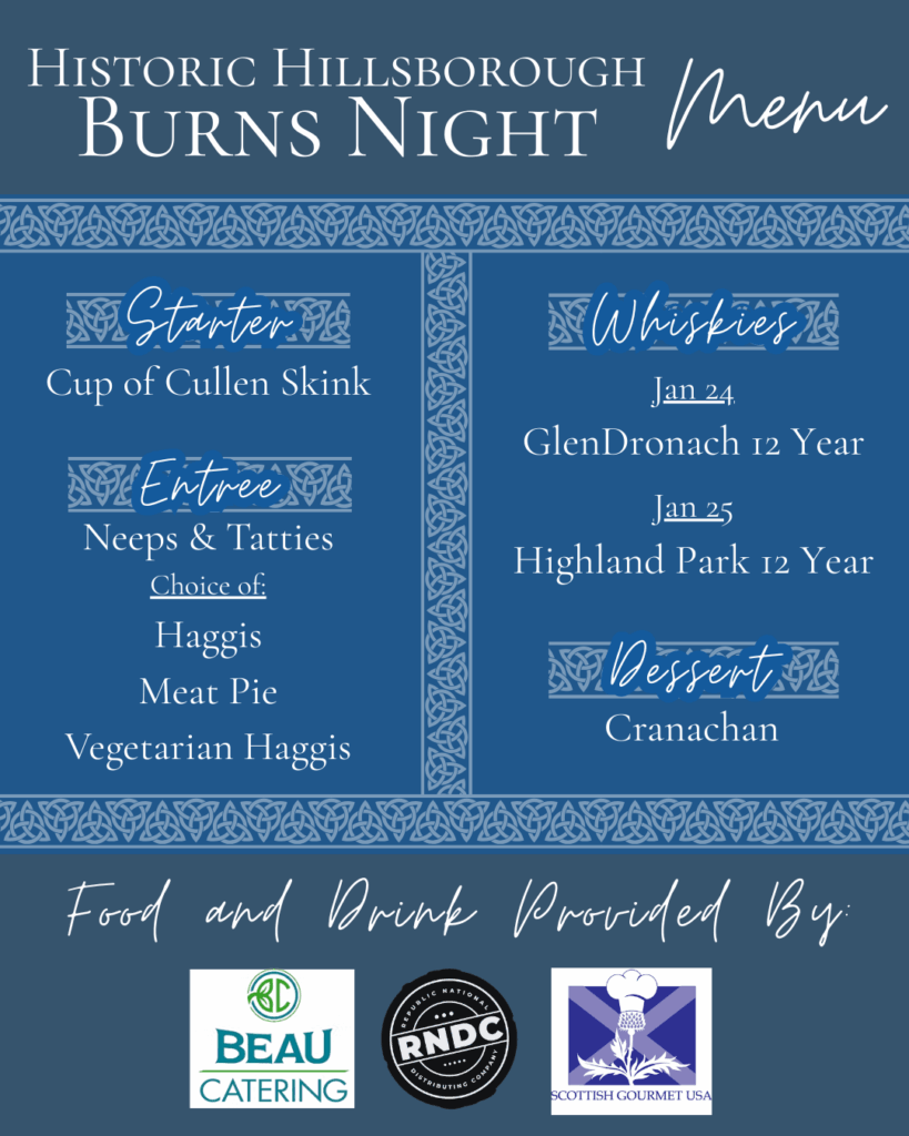 Celebrate Scotland’s national poet and heritage with an immersive Burns Night Scottish Dinner. Enjoy an evening filled with traditional music, lively Highland dance from the Monroe School of Highland Dance, and classic Scottish fare, paired with a dram of fine whisky. Guests will also have the opportunity to explore local history while taking part in time-honored Burns Night traditions, including poetry, toasts, and storytelling. Join us for a warm, festive celebration of Scottish culture and community.