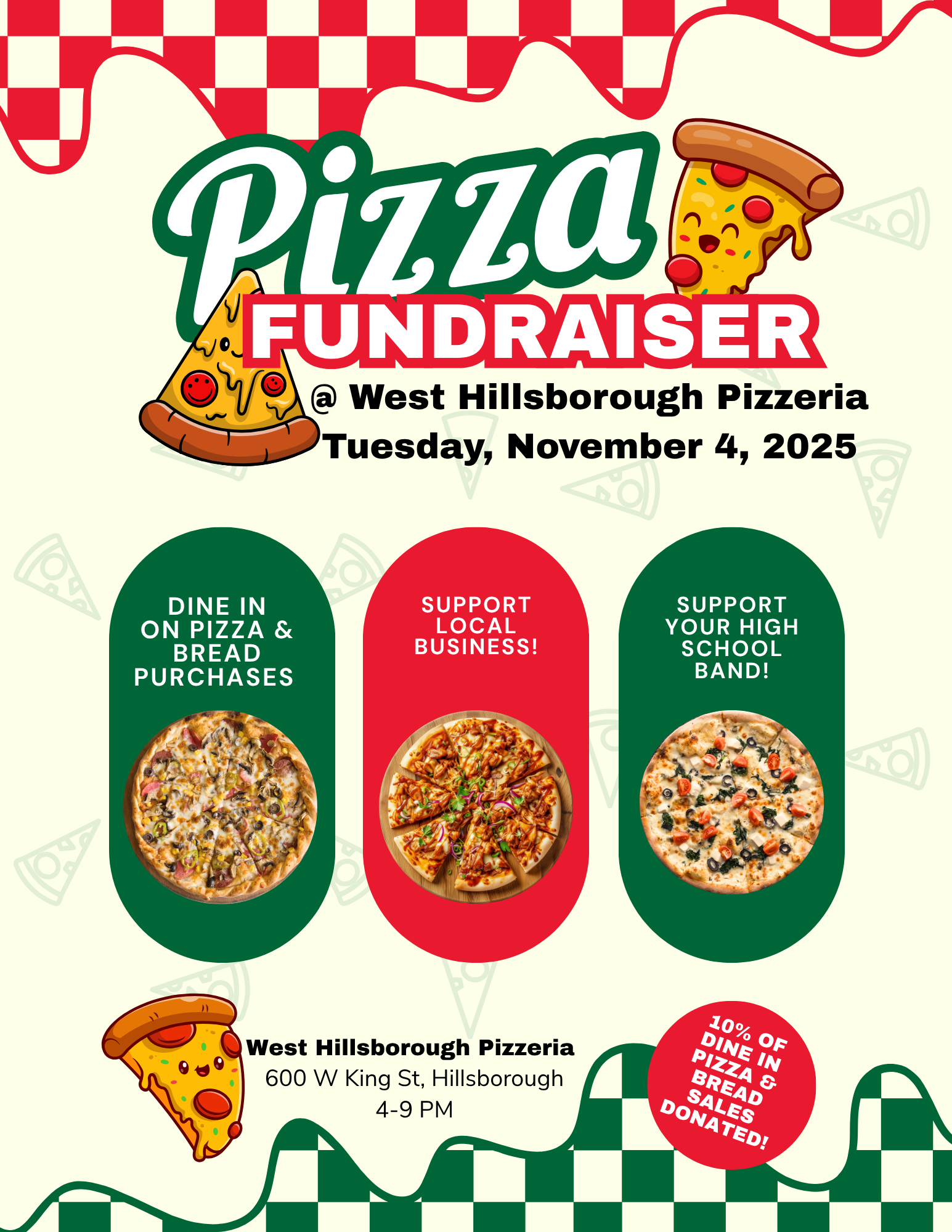 West Hillsborough Pizzeria will be donating 10% of pizza and garlic bread sales to the Orange High School Band on Tuesday, November 4th. So, give a “pizza” of your heart and enjoy West Hillsborough Pizzeria.
