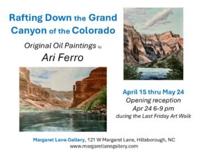Oil on canvas paintings of views of the Grand Canyon by local artist Ari Ferro. The walls of the canyon are painted from original photos taken from a raft being navigated down the river, or from campsites along the banks of the river. Opening reception during the Last Friday Art Walk April 24, 6-9 pm. |