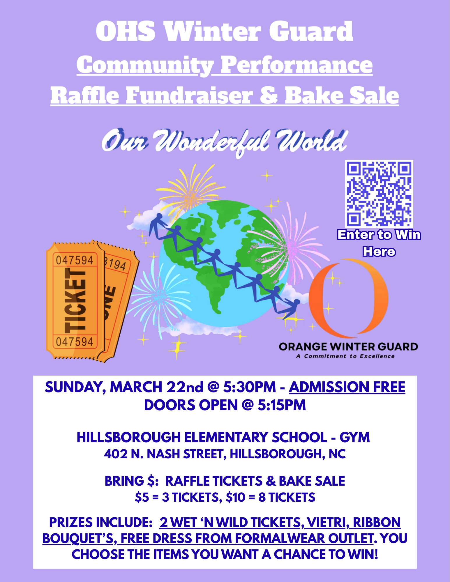 Mar 22 5:30 pm - 6:00 pm Orange High School Winter Guard Community Performance Hillsborough Elementary School 402 N Nash Street, Hillsborough Event Details Get Directions
