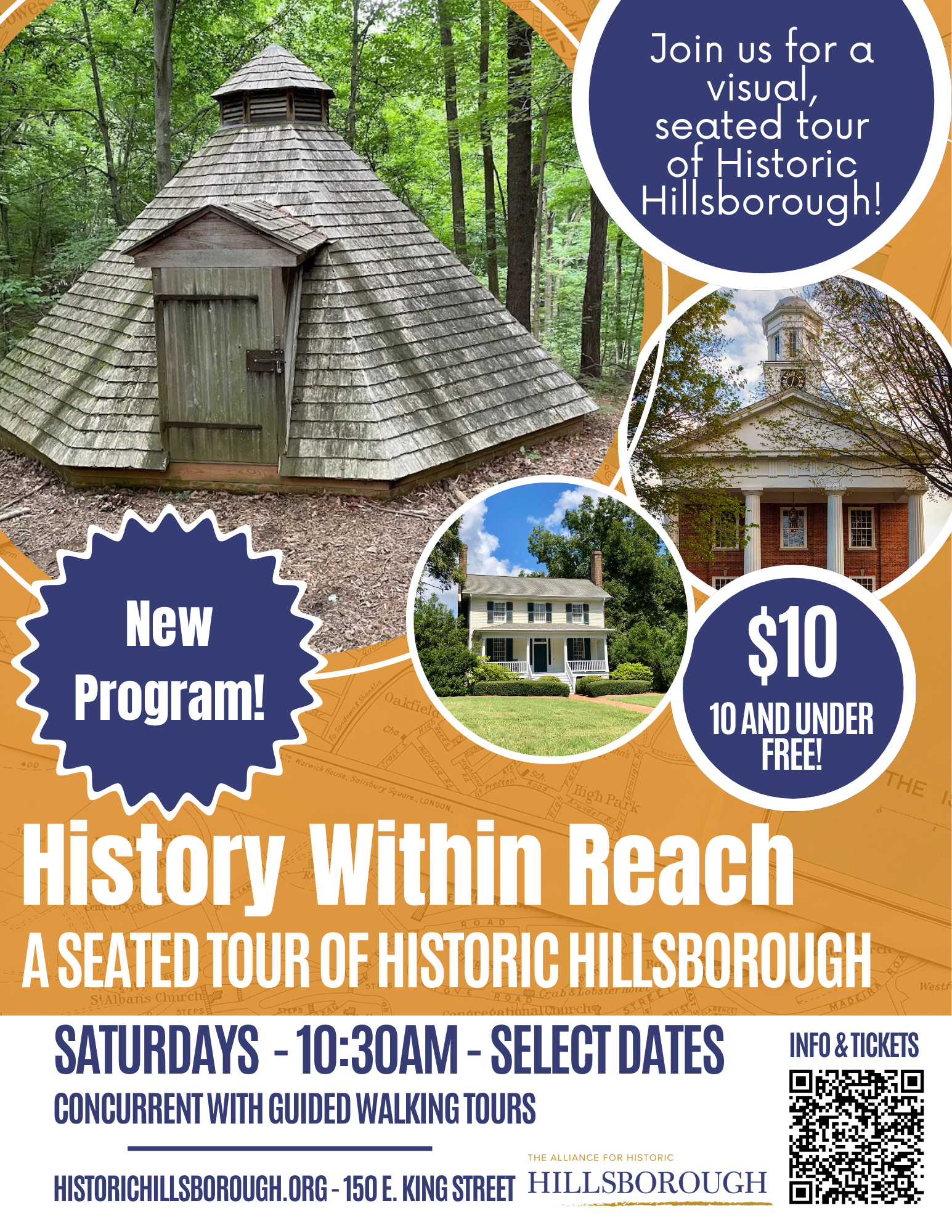 Aug 15 10:30 am - 12:30 pm History Within Reach: A Seated Tour of Historic Hillsborough Hillsborough Visitors Center 150 E King Street, Hillsborough Event Details Get Directions