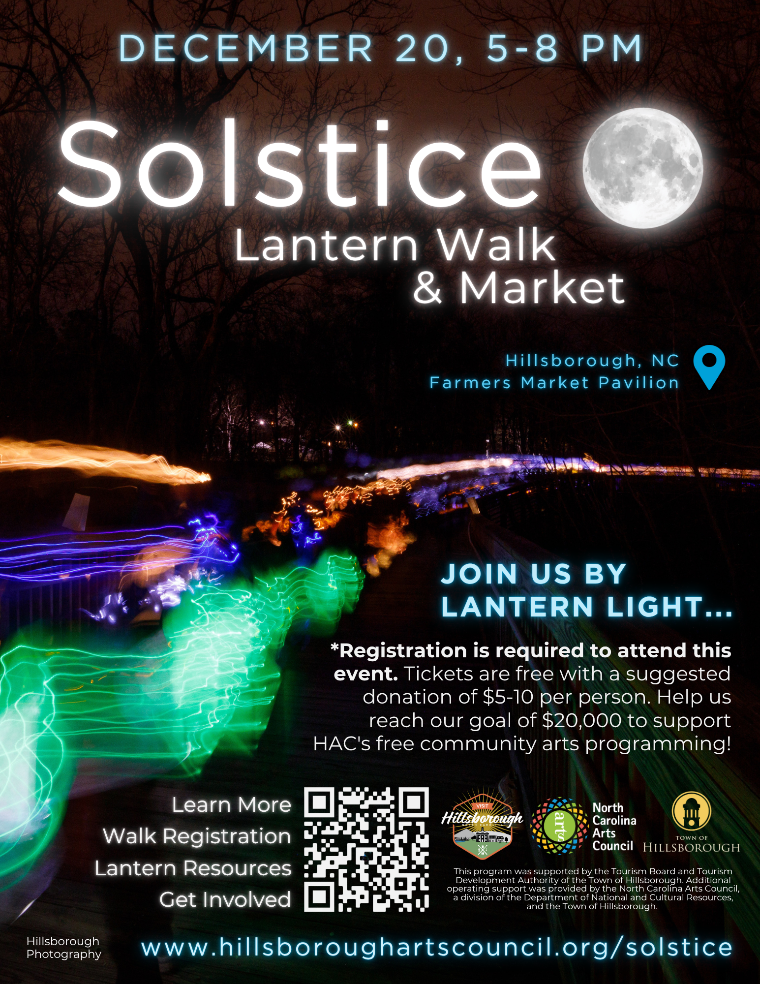 Dec 20 5:00 pm - 8:00 pm Solstice Lantern Walk & Market Eno River Farmers Market Pavillion 144 E. Margaret Ln, Hillsborough Event Details Get Directions