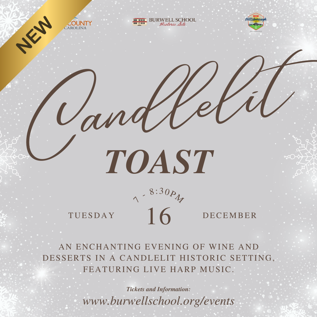 Join us for an enchanting evening at the Burwell School Historic Site. Enjoy a selection of wines and decadent desserts in the historic home, candlelit and decorated for the holidays.