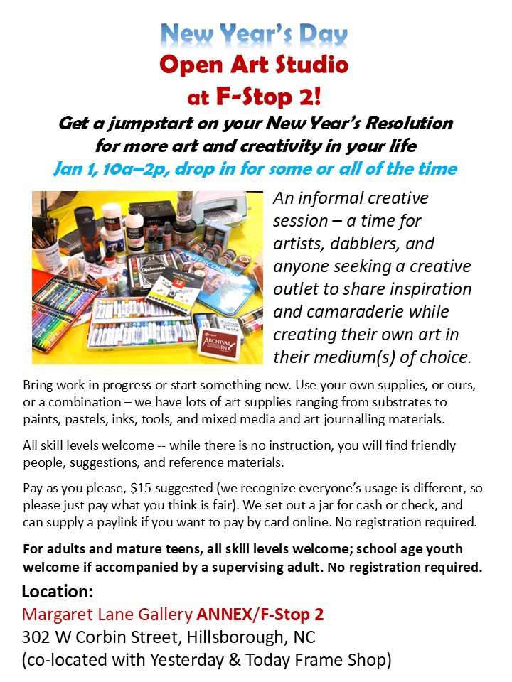 Jan 1 10:00 am - 2:00 pm New Year’s Day Open Art Studio Margaret Lane Gallery Annex/ F-Stop 2 302 W Corbin, Hillsborough Event Details Get Directions