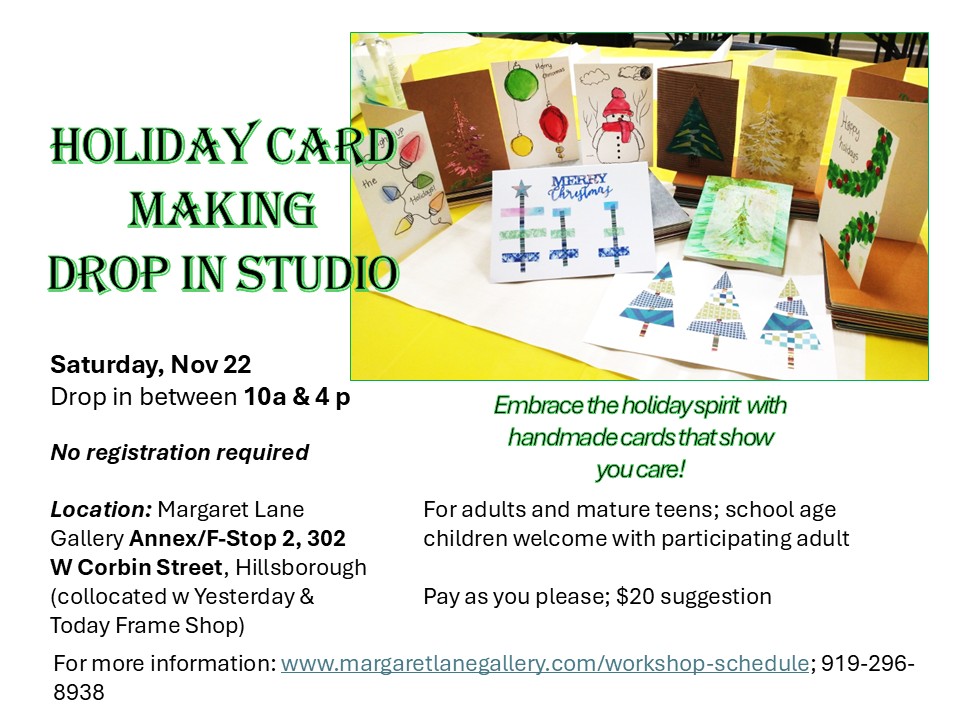 Margaret Lane Gallery 121 West Margaret Lane, Hillsborough, NC, United StatesA diverse collection of art produced by caregivers of loved ones with dementia. Opening reception is Sunday, November 9, 3:30-5:30 pm. Hosted at Margaret Lane Gallery.