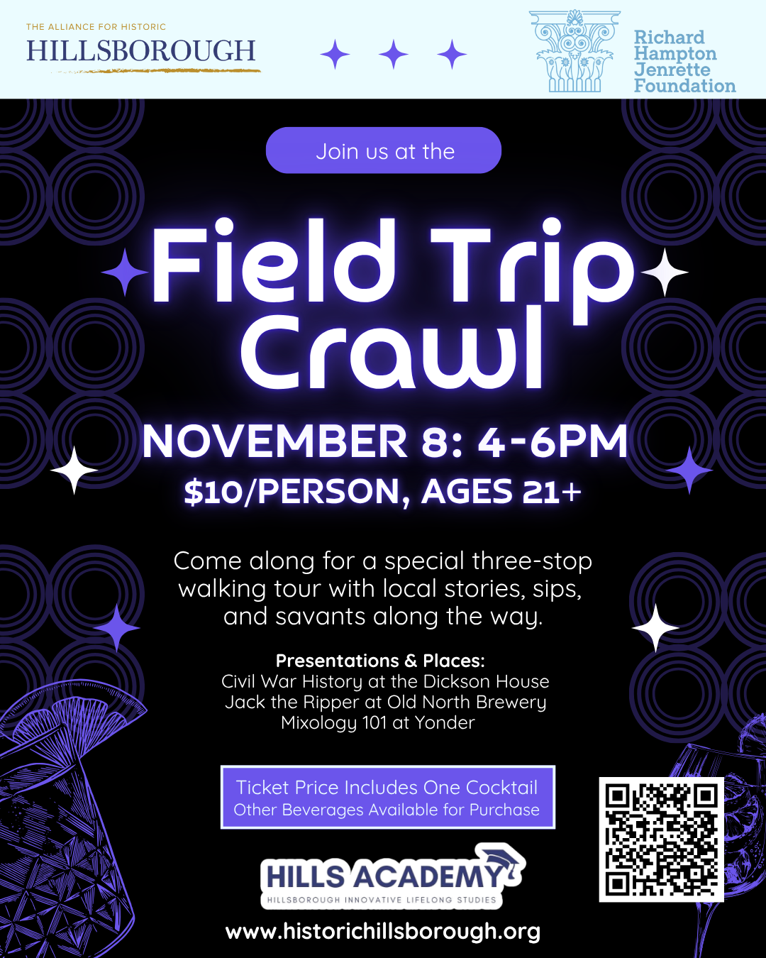 Hillsborough Visitors Center 150 E King Street, Hillsborough, NC, United StatesJoin us for a Field Trip Crawl, a three-stop walking tour with stories and sips along the way. Explore Civil War history at the Dickson House, learn about Jack the Ripper at Old North Brewery, and then step behind the bar at Yonder, where Eryk Pruitt will guide you in crafting your own cocktail! 11/8 | 4pm-6pm | $10 per ticket, must be 21+ to purchase.